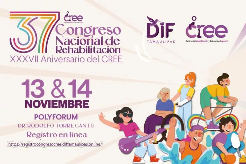 Ciudad Victoria, Tamaulipas. En el marco del trigésimo séptimo aniversario del Centro de Rehabilitación y Educación Especial (CREE), el Sistema DIF Tamaulipas que preside la doctora María de Villarreal invita a profesionales del área médica y a la población en general a participar en el XXXVII Congreso Nacional de Rehabilitación, que se llevará a cabo los días 13 y 14 de noviembre en el Polyforum de la capital del estado.