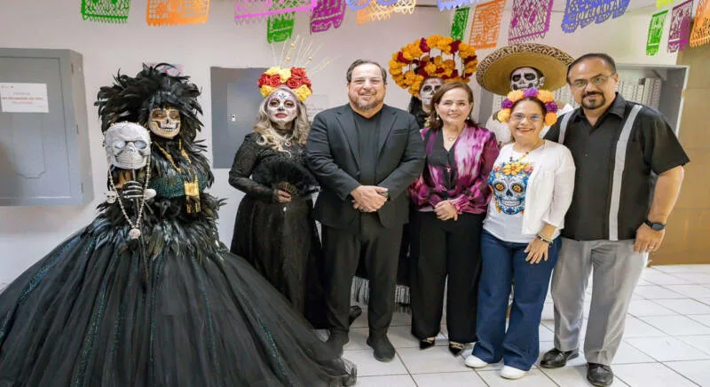 Miguel Ángel Valdez García, secretario de Educación, presidió esta celebración que se efectuó en la explanada principal de la dependencia educativa, donde las y los trabajadores participaron instalando el altar, escribiendo calaveritas y caracterizándose como catrinas y catrines.
