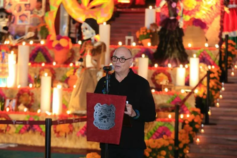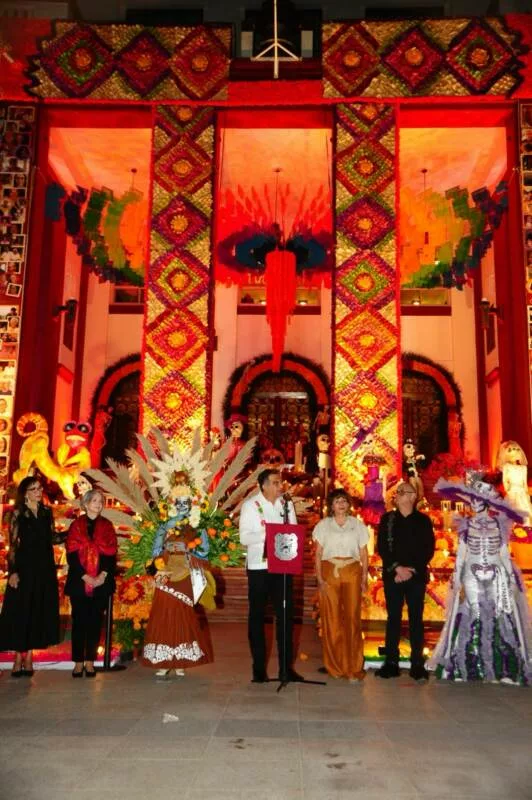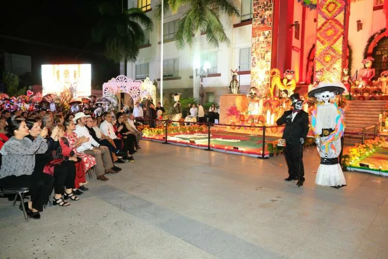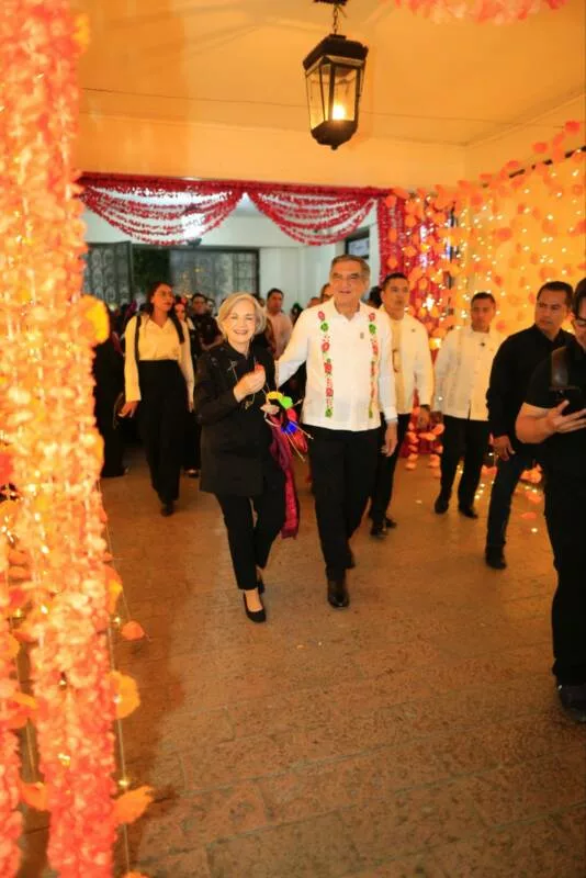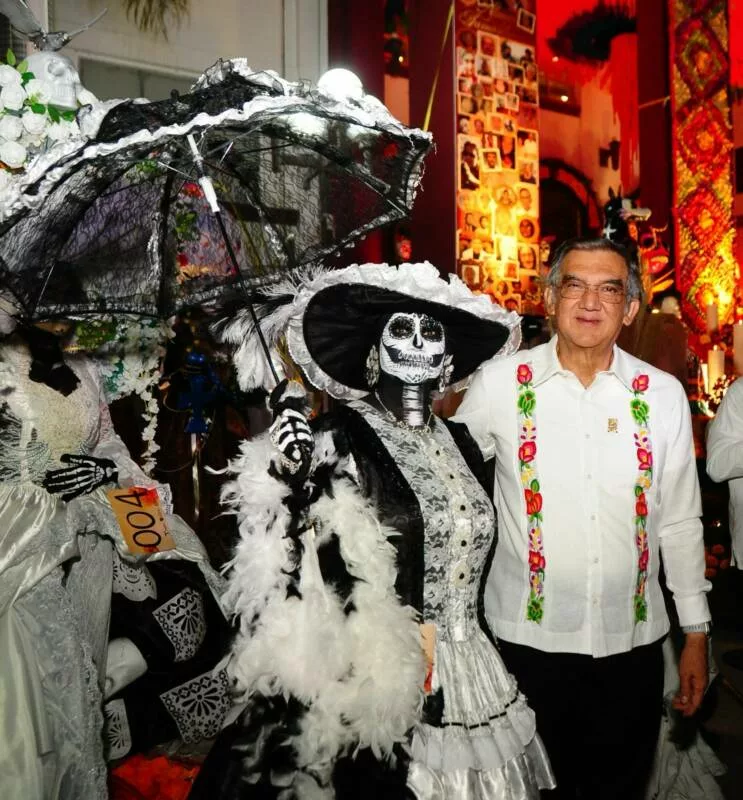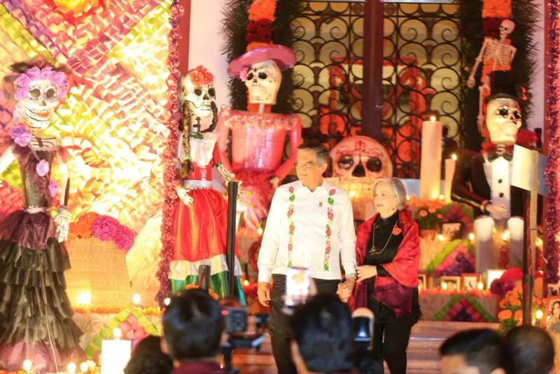 Ciudad Victoria, Tamaulipas.- En un ambiente impregnado por el aroma de la flor de cempasúchil, el pan de muerto y las luces de las velas, el gobernador Américo Villarreal Anaya y la presidenta del Sistema DIF Estatal, María de Villarreal presidieron la premiación del concurso estatal de catrinas y catrines "Almas Tamaulipecas" y la muestra del altar monumental del Día de Muertos en las escalinatas de Palacio de Gobierno .
