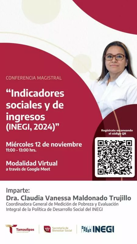 Ciudad Victoria, Tamps.-La videoconferencia magistral “Indicadores Sociales y de Ingresos (INEGI, 2024)”, será dictada por la Dra. Claudia Vanessa Maldonado Trujillo, coordinadora general de Medición de Pobreza y Evaluación Integral de la Política de Desarrollo Social del INEGI, el próximo miércoles 12 de noviembre, informó la secretaria de Bienestar Social Silvia Casas González.
