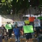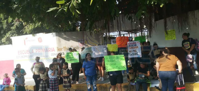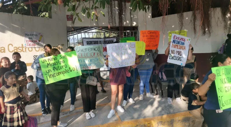 Con cartulinas que mostraban mensajes como “Exigimos asignación de docente frente al grupo”, “Queremos solución ya, Secretario de Educación” y “Tenemos derecho a educación digna”, los manifestantes se mantienen en el exterior de la escuela a la espera de la llegada de representantes oficiales y de la asignación de un maestro titular.