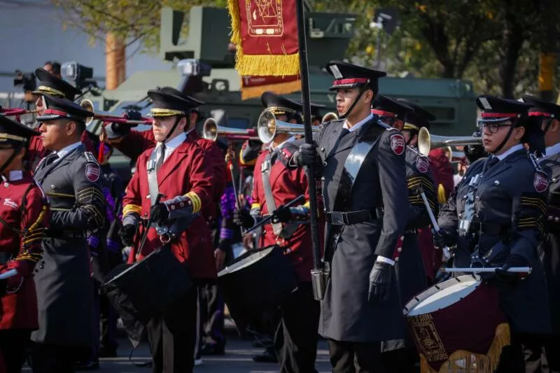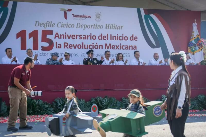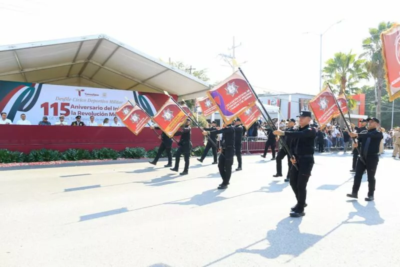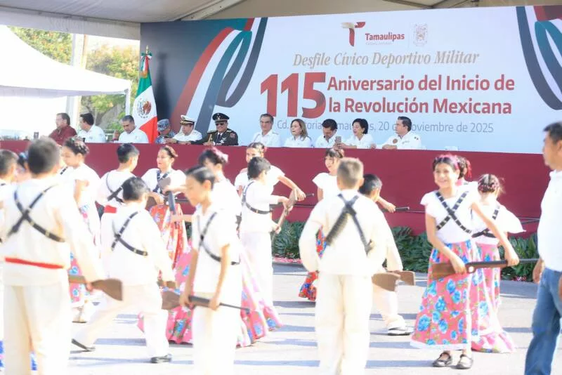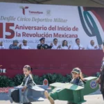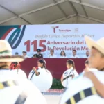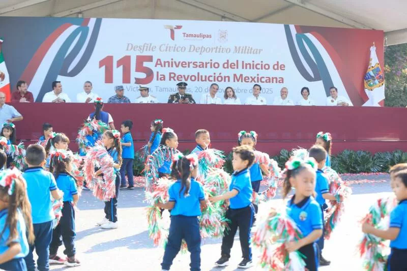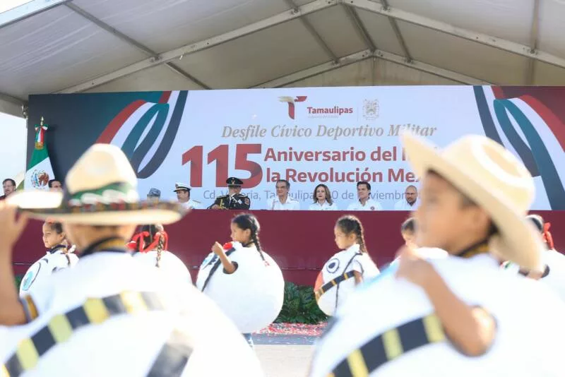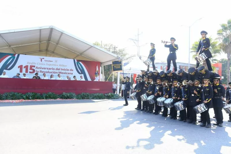 Ciudad Victoria, Tamaulipas.- Con la presentación, por primera vez, de una banda de guerra monumental integrada por 500 alumnos y alumnas de diferentes municipios, este jueves se conmemoró el desfile cívico, deportivo y militar, con la entusiasta participación de estudiantes, jóvenes, niñas y niños, en conmemoración del 115 aniversario del inicio de la Revolución Mexicana, presidido por el gobernador Américo Villarreal Anaya.