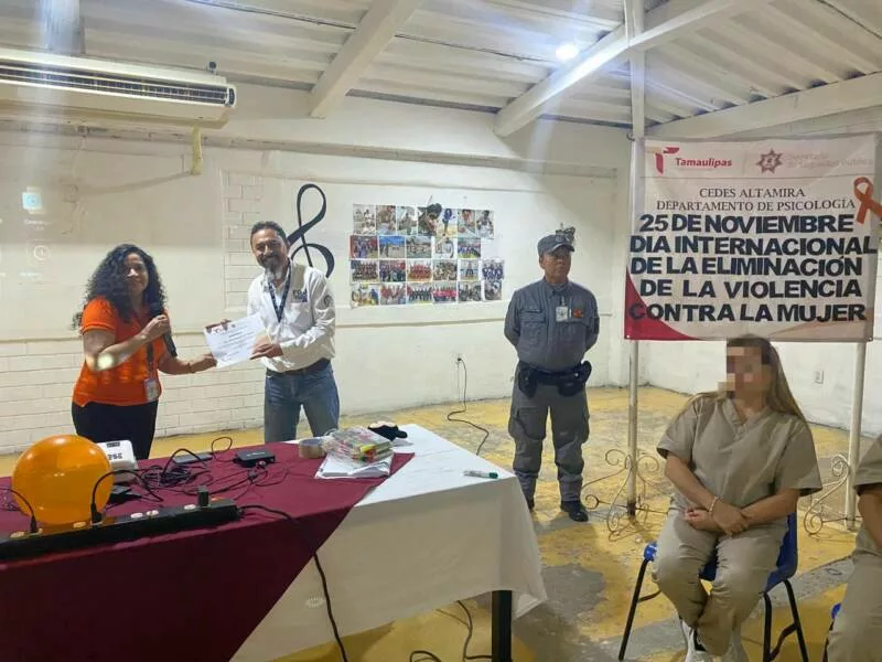 Altamira, Tamaulipas. - Entre las actividades conmemorativas del Día Internacional para la Eliminación de la Violencia contra las Mujeres, desempeñadas por la Secretaría de Seguridad Pública de Tamaulipas (SSPT) el Centro de Ejecución de Sanciones (CEDES) del municipio de Altamira llevó a cabo un torneo relámpago de voleibol y una conferencia a cargo del psicólogo de la Fiscalía General de Justicia del Estado de Tamaulipas (FGJT), Juan Gabriel Solís Tavera.