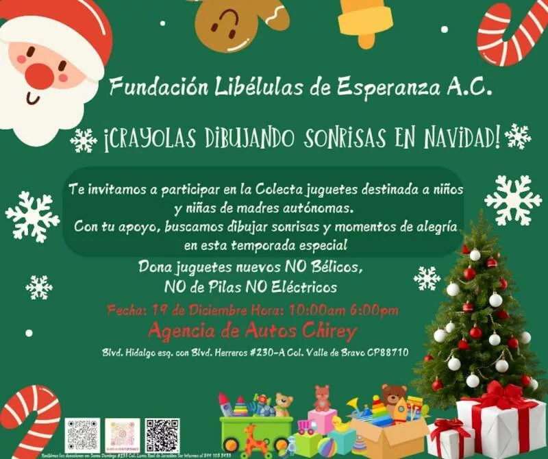 La Fundación “Libélulas de Esperanza” invita a la comunidad de ambos lados de la frontera a colaborar en la Colecta de Juguetes “Crayolas Dibujando Sonrisas en Navidad”. Apoyando en esta temporada a niñas y niños de madres autónomas y reciban un regalo con cariño en Navidad.