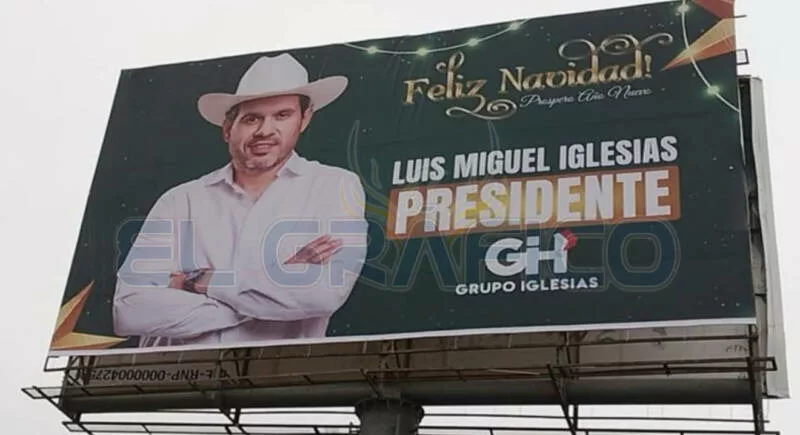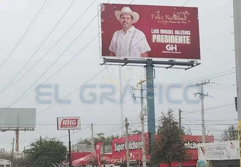 Los anuncios panorámicos, firmados por Grupo Iglesias, muestran al empresario portando su característico sombrero blanco, una imagen que vecinos de distintas colonias asocian con jornadas de apoyo comunitario, entrega de ayuda social y acompañamiento a sectores históricamente olvidados.