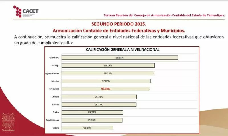 Durante la sesión se informó que Tamaulipas alcanzó un resultado nacional de 97.83%, lo que ubica al estado en un nivel de cumplimiento alto y dentro de los primeros cinco lugares del país. Este logro refleja el compromiso de las instituciones públicas tamaulipecas con la correcta aplicación de las normas contables y la transparencia en el manejo de los recursos.