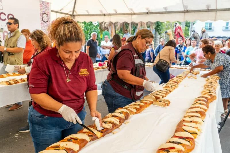 Mónica Villarreal, acompañada de síndicos, regidores, directores y secretarios, detalló que los festejos de Día de Reyes, incluyeron la instalación en la plaza de armas, de una monumental rosca de más de 90 metros que fue compartida con más de 600 ciudadanos de la zona centro; además de emprender una campaña de donación de cascos a motociclistas en el exterior de las Dirección de Tránsito y Vialidad, donde junto a elementos de la corporación, distribuyó este esencial equipo de seguridad personal, acompañado de una rosca de reyes.