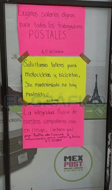 Los mensajes, firmados por la agrupación A.P. Victoria, exigen respeto al contrato colectivo de trabajo, cascos, uniformes, refacciones para motocicletas y bicicletas, así como talleres de mantenimiento. “Sin mantenimiento no hay movimiento”, se lee en uno de los carteles.