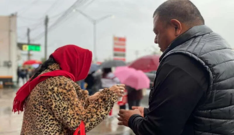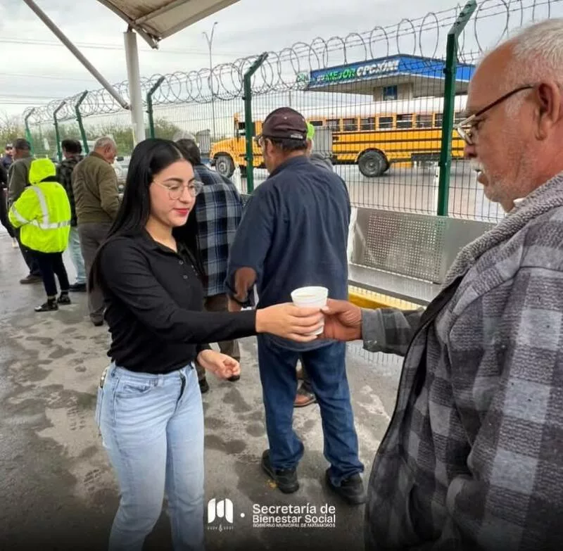 H. Matamoros, Tamaulipas.- Por instrucción del alcalde de Matamoros, Beto Granados, en una mañana marcada por las lluvias y durante la entrega correspondiente a las letras “P” y “Q”, personal de la Secretaría de Bienestar Social llevó café caliente a las personas adultas mayores que acudieron a realizar sus trámites en las sucursales del Banco del Bienestar Sexta, Villa Madrid y Ejido Galaneño.