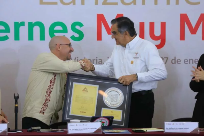 Ciudad Victoria, Tamaulipas.- En el marco del lanzamiento del programa “Viernes muy mexicano”, la Confederación Nacional de Cámaras de Comercio, Servicios y Turismo (CONCANACO SERVYTUR), que preside Octavio de la Torre Steffano, otorgó un reconocimiento al doctor Américo Villarreal Anaya, gobernador de Tamaulipas, como muestra de reconocimiento a su labor y compromiso con el desarrollo económico del estado y del país.