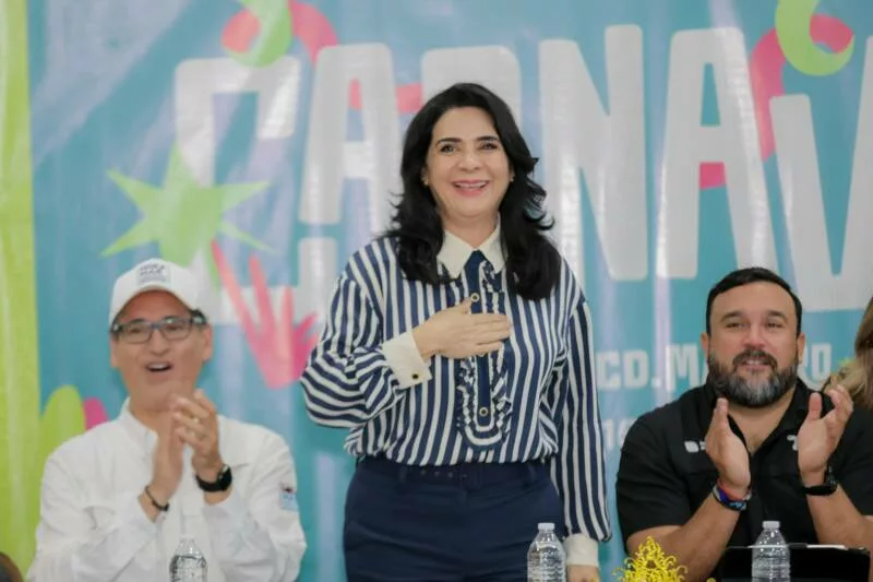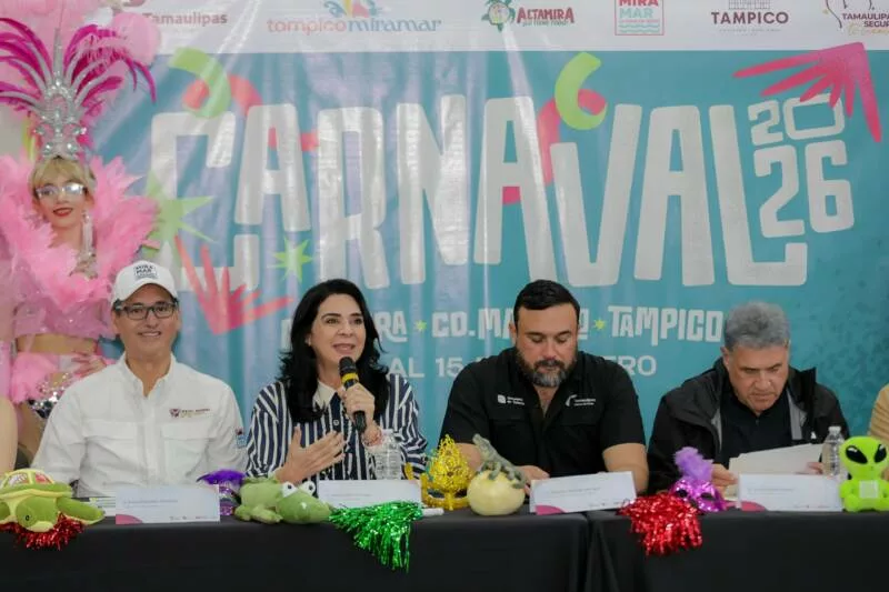 Mónica Villarreal Anaya, alcaldesa de Tampico, acompañada del secretario de turismo en el Estado, Benjamín Hernández Rodríguez y los presidentes municipales de Ciudad Madero y Altamira, Erasmo González Robledo y Armando Martínez Manríquez respectivamente, encabezó la sesión informativa para dar a conocer los pormenores del carnaval conurbado 2026, que se efectuará del 12 al 15 de febrero en los municipios sur tamaulipecos.