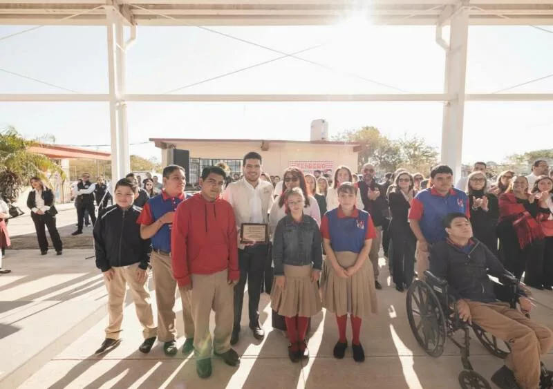 H. Matamoros, Tamaulipas.– Hoy lunes, inicio de semana, el alcalde de Matamoros, Beto Granados, encabezó la Ceremonia de Honores a la Bandera en el Centro de Atención Múltiple (CAM) Laboral “Alfonso Sánchez Sánchez”, ubicado en la colonia Los Encinos, donde además se llevó a cabo la inauguración oficial de una nueva techumbre y explanada que fortalecerán las actividades educativas, cívicas y recreativas del plantel.