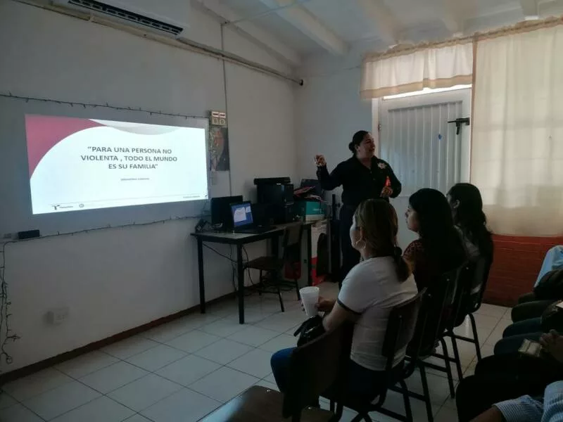 Asimismo, en la Escuela Primaria Venustiano Carranza se llevó a cabo la plática “Violencia Familiar” dirigida a padres y madres de familia, actividad que se complementó con la entrega de violentómetros y el tríptico “¡Alto al Feminicidio!”, herramientas para reconocer los grados de violencia en las relaciones familiares o de pareja.