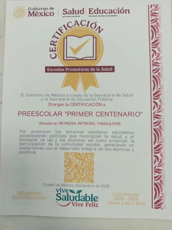 Al cumplir el objetivo de capacitación a personal docente, directivos y personal auxiliar en las escuelas de Reynosa. Se realizó una ceremonia oficial de entrega de Certificados de Escuelas Saludables por parte del Distrito de la Salud para el Bienestar IV en Reynosa.
