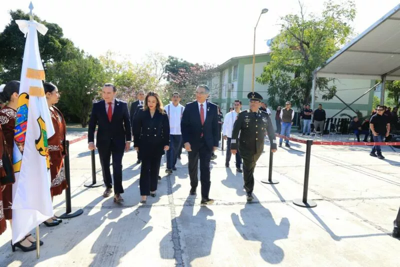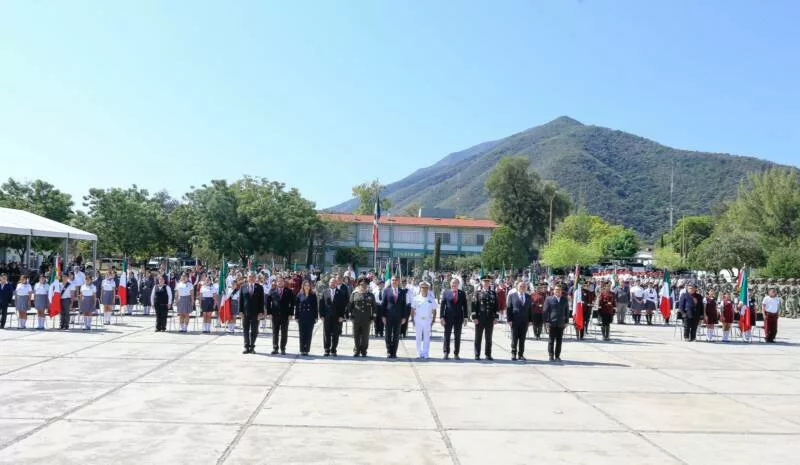 Durante el evento cívico, que incluyó un enlace con la ceremonia encabezada por la presidenta Claudia Sheinbaum Pardo, y en el cual también se izó la bandera del Cerro del Aura, el mandatario estatal, quien hizo entrega del lábaro patrio para su guarda y custodia a cinco escuelas, reafirmó el compromiso de las nuevas generaciones con los valores y símbolos patrios.