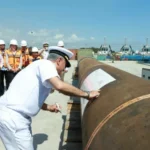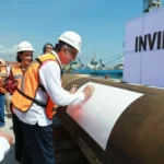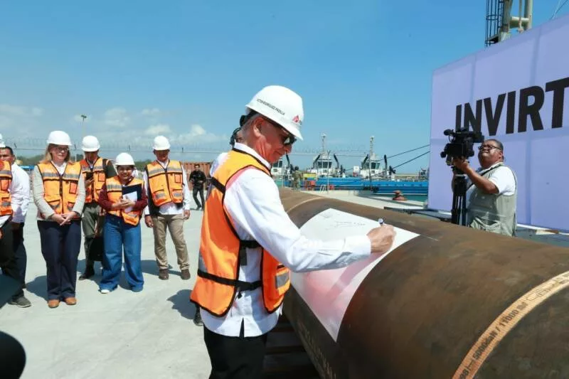 Posterior al evento, el gobernador y las y los invitados se trasladaron al patio de maniobras para realizar la firma de los cabezales de perforación que serán trasladados a la plataforma marítima.