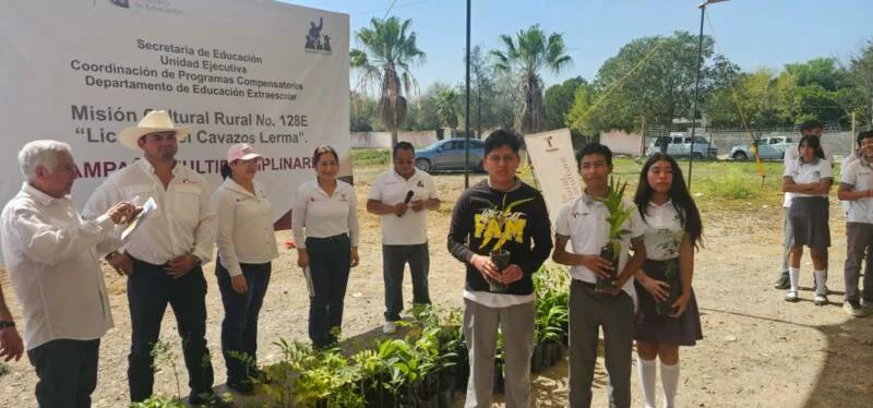Durante la jornada se plantaron especies como lluvia de oro, palo de rosa, cedro rojo y encino verde, entre otras, que en los próximos años brindarán sombra y frescura tanto a la plaza principal del ejido como a las instalaciones del plantel educativo.