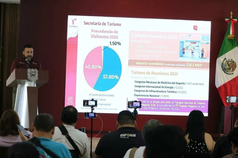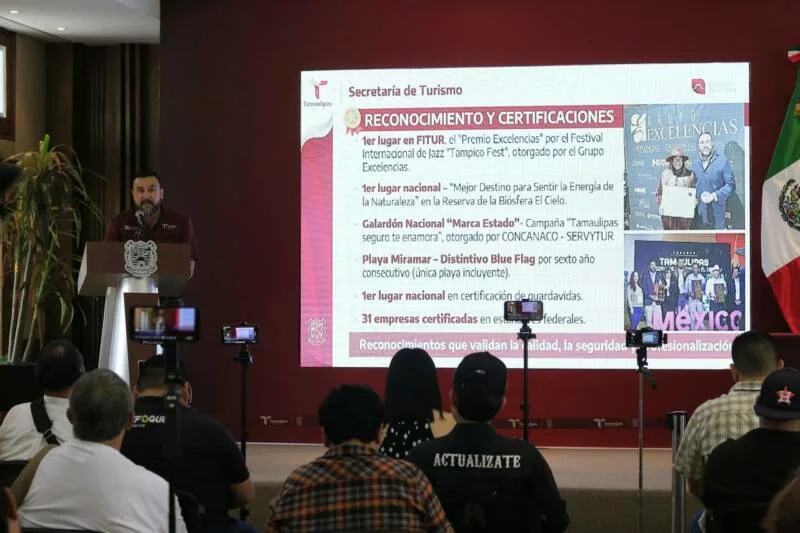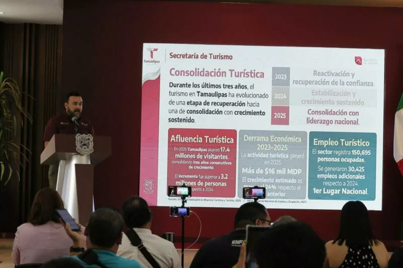 En la conferencia de prensa, el secretario de Turismo, Benjamín Hernández Rodríguez destacó que en los últimos tres años se ha logrado la consolidación turística de Tamaulipas con liderazgo nacional, hasta registrar una afluencia histórica en 2025 de 17.4 millones de visitantes; 3.2 millones superior respecto a 2024, lo que permitió generar una derrama de más de 16 mil MDP, un 24 por ciento respecto al año anterior.