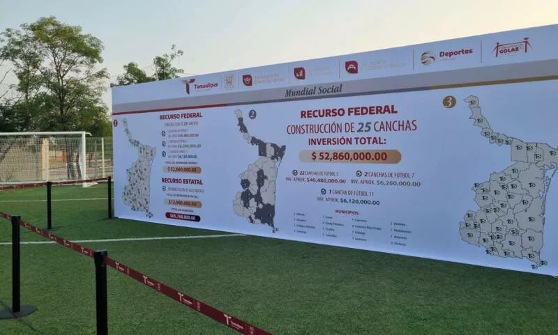 En el marco de la ceremonia de Honores a la Bandera realizada el lunes y que encabeza el gobernador del estado Américo Villarreal Anaya, la titular de SEBIEN, destacó que gracias a la gestión del Ejecutivo estatal serán invertidos 52 millones 860 mil pesos de recurso federal en la construcción de 26 canchas de futbol en 17 municipios, además, con recursos propios por el orden de los 12 millones 900 mil pesos, se realizará la rehabilitación de 43 canchas, lo que significa una inversión de hasta 300 mil pesos por municipio.
