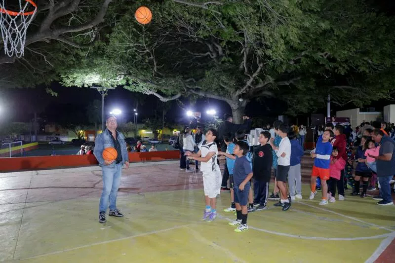 Tras el corte de listón, se realizaron dinámicas con las niñas y los niños presentes, a quienes se les entregaron balones de fútbol y básquetbol para que disfruten de este espacio público rehabilitado.