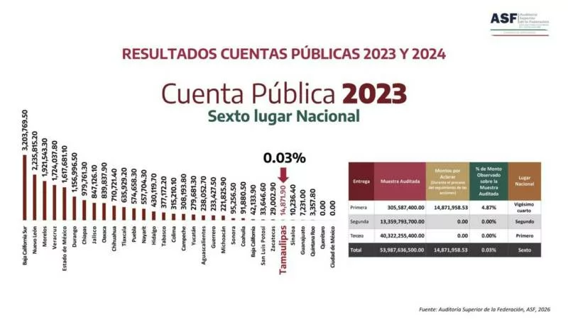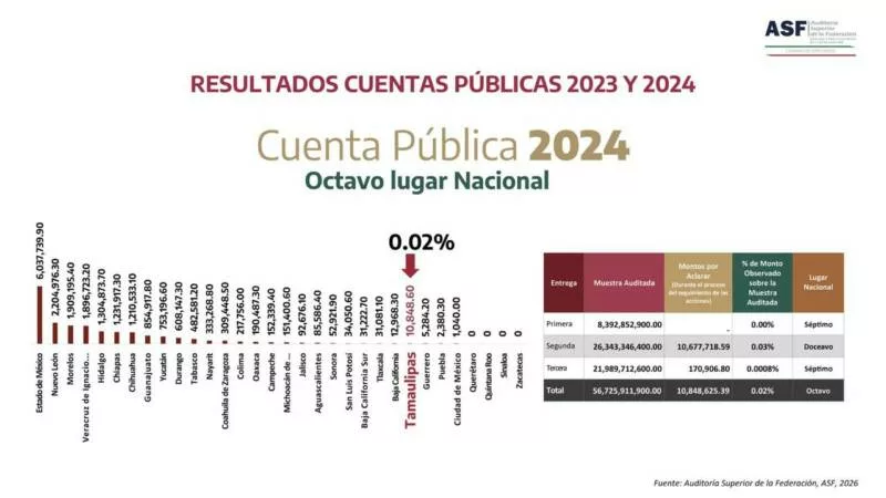 Ciudad Victoria, Tamaulipas.- En el marco del Cuarto Informe de Gobierno, el gobernador Américo Villarreal Anaya destacó la fiscalización de la Cuenta Pública 2024 realizada por la Auditoría Superior de la Federación (ASF), donde se reportó un monto por aclarar de apenas el 0.02% del total fiscalizado, ubicando a Tamaulipas como uno de los estados que mejor desempeño tienen en la materia.